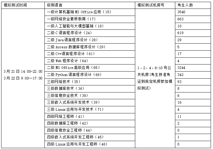 按照教育部考试中心的要求,第77次全国计算机等级考试于2026年3月28-30日举行。为了提高考试质量,确保考试工作顺利实施,3月21—22日进行考前模拟测试环节,地点为丹枫园校区实训楼三楼1、2、4-10号公共机房。现将模拟上机测试和正式上机考试相关事项通知如下: