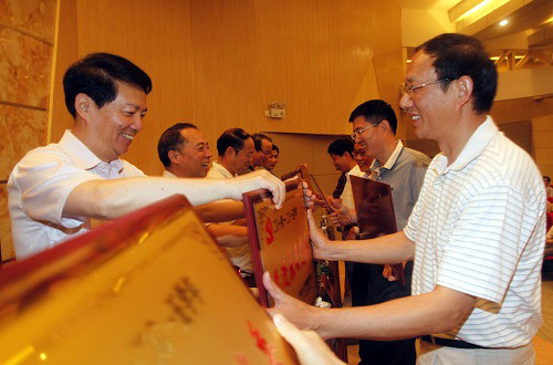 在轻松愉快的乐曲声中,校领导向受表彰的先进集体代表颁发了奖牌。