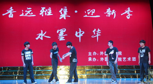 迎新晚会在香远雅集艺术团开场舞中拉开了序幕,主持人用中、英、日三种语言介绍了晚会,充分展现了外国语学院的专业特色。整场晚会围绕葱茏九院、水墨中华、炫彩世界三大主线展开,分别从不同角度展现了外院学子的风采。