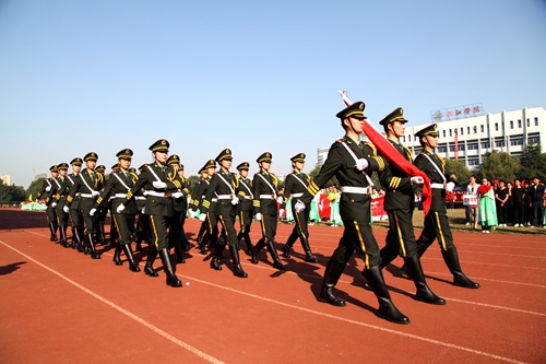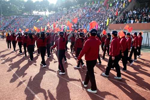 上午8点,场内所有人员注视田径场中心,护国旗队、护校旗队、护会旗队、护会徽队伴随着铿锵有力、激昂奋进的运动员进行曲依次入场。他们英姿飒爽,他们意气风发,他们代表了九院学子对此次运动会的关注与热情。鲜艳的五星红旗在初秋的晨风中鲜艳夺目,校旗、会旗和会徽交相辉映,庄严、神圣。紧随其后的管乐队、鲜花队、彩旗队彰显了我校学子的青春风采,裁判员代表队整齐的步伐彰显了他们严谨、公正的执法风格。