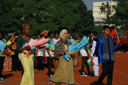 国际交流学院的留学生代表队他们身着亮丽的民族服饰,手捧鲜花,顺着跑道向大家走来,并伴着欢快音乐跳起特色的舞蹈,总会成为全场的一道亮丽的风景线。