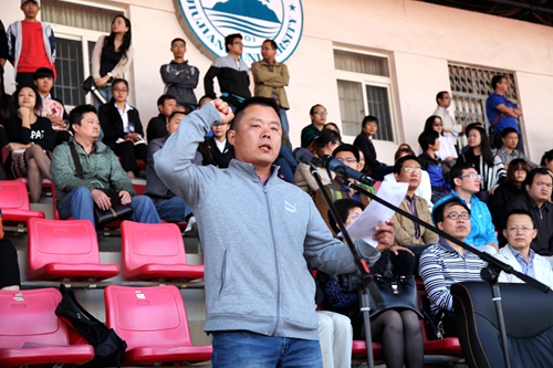 甘校长在致辞中希望全体运动员尊重裁判,尊重对手,顽强拼搏,奋勇争先,赛出风格;希望全体裁判员,工作人员坚守岗位,严守流程,热情工作,公正裁判;希望同学们讲文明,守纪律,服从管理。甘校长最后预祝第十四届校运会取得圆满成功。
