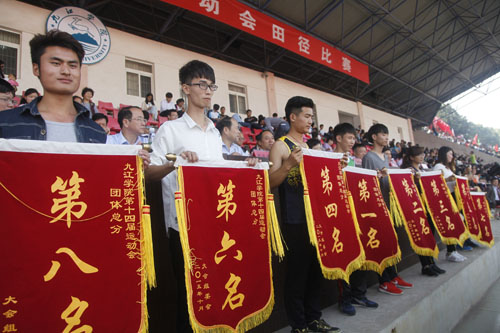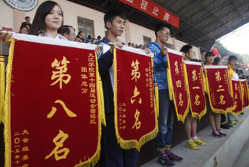 经过两天半紧张、激烈、精彩的角逐,在圆满完成了全部比赛项目后,10月17日上午,九江学院第十四届田径运动会在此起彼伏的欢腾声、呐喊声、助威声中胜利闭幕。在家校领导甘筱青、吴桃娥、纪岗昌、王万山、陶春元、杨焱林、魏立平、杨耀防出席了闭幕式并为获得精神文明奖、团体总分奖的单位颁奖。闭幕式由副校长王万山主持。
