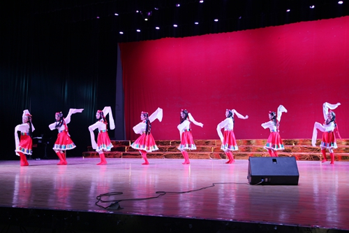 汇演结束后,吴桃娥和相关部门负责同志走上台慰问演职人员,并合影留念。