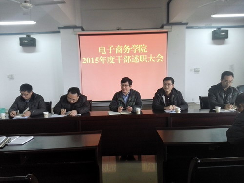 会上,电子商务学院党委书记丁文林和院长郑祚双分别代表学院党委和行政对2015年的工作进行了总结汇报。随后,三位处级领导干部分别进行了个人年度工作述职。全院教职工根据述职情况客观认真的填写了民主测评表。