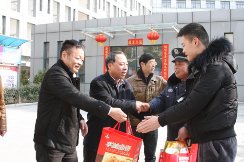在主校区,甘筱青一行先后来到基建处、印刷厂、保卫处监控中心、水电科和南门治安岗亭。每到一处,甘筱青校长都对仍在坚守工作岗位的同志表示感谢,向他们送上节日慰问品,嘱咐他们在欢度节日的同时,要时刻牢记为校园安全保驾护航,确保教职工安全舒心地度过一个欢乐祥和的春节;在节后的工程建设中,在确保质量的前提下,要尽快完成相关基建项目。