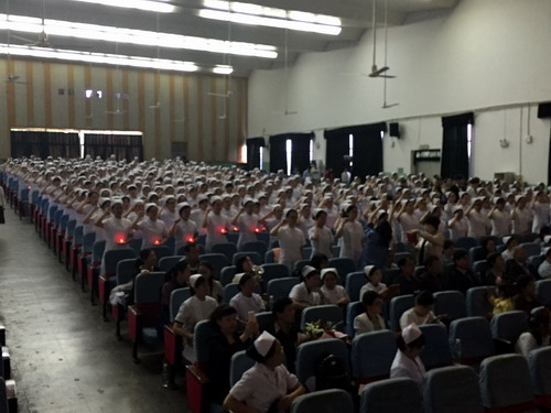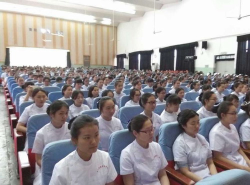 九江市护理协会理事长陈锐致辞,她表达了对南丁格尔精神的崇敬,向长期以来关心护理教育工作的领导及老师表示了衷心的感谢;她提出,今天的护理事业正面临巨大的挑战,同学们要真诚地去热爱护士职业,全身心地投入护士职业;陈理事长还提到,今年是我国医改的收关之年,将为护理事业的发展提供极大的发展平台,同学们应当发奋学习,勤练操作,掌握扎实的临床技能,共同推进护理事业的快速发展。