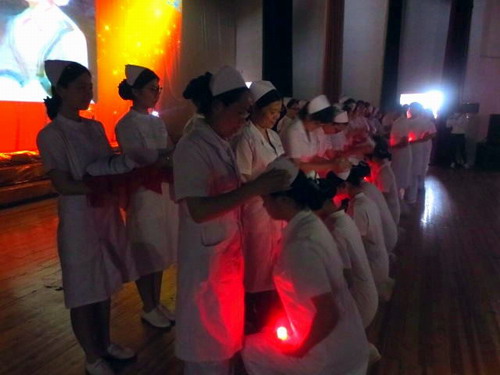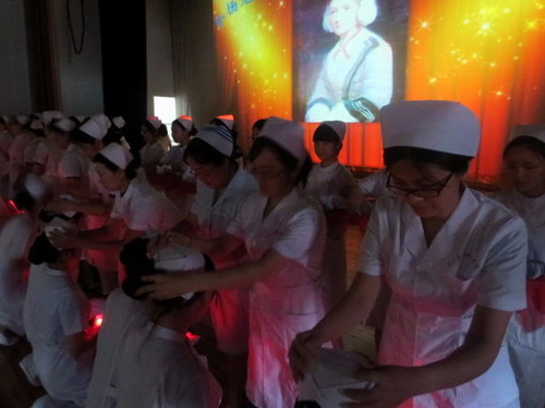 随着轻柔的音乐奏起,授帽仪式开始。象征南丁格尔精神的圣灯在护理教育老前辈熊冬霞老师的手中点燃,指引着同学们走向神圣而光荣的护理事业。在圣灯下,同学们向为护理事业默默奉献的老前辈熊老师献上鲜花,送上自己崇高的敬意。随后,700余名护理学院学生身着护士服,双手捧着烛光灯,虔诚地单膝跪地,等待老师们为她们戴上圣洁的燕尾帽。仪式简约有序,气氛庄重肃穆,令观众动容。随后同学们戴着神圣的燕尾帽,紧握右拳,庄严宣誓:“燃烧自己,照亮他人,将毕生经历奉献给护理事业,”在铮铮誓言中表达了自己不辱白衣天使神圣使命的决心。整个会场在烛光的笼罩下神圣而庄严。