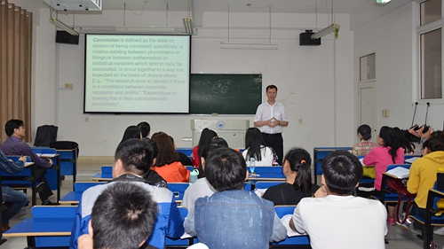 5月27日上午,杨耀防副校长来到义丰楼412教室,听了经管学院中英合作班外籍教师Andrei Munteanu 讲授的《商务环境》课程。国际交流学院院长夏修龙,经管学院院长潘旭华、党委书记花金龙等一同听课。