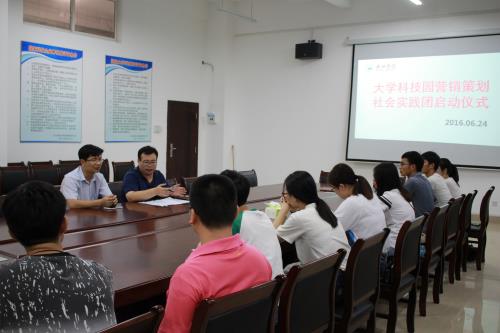为进一步切实服务好大学科技园内企业,更好地支持和鼓励大学生投身创新创业实践,提升大学生的综合素质与创新能力,校团委和大学科技园联合建立一支“大学科技园企业营销策划社会实践团”队伍,专项服务于大学科技园,为企业提出诊断、谈判及营销策划方案,帮助园区教师企业成长壮大。6月24日晚,“大学科技园企业营销策划社会实践团”在大学科技园会议室举行启动仪式。校团委书记闫来英、科研处副处长宋士华、实践团成员等参加了仪式。