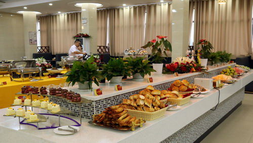 为体现节俭办会、凸显地方特色的接待要求,中心反复调整自助餐厅区域布置以便捷就餐服务,饮服中心领导亲自带领工作人员细致地对餐厅环境细节及周边环境进行细致高标准的清洁打扫。为了营造清新舒适的用餐环境提升服务标准,饮食服务中心还特地聘请了旅游学院的服务接待教师从氛围营造入手,调整绿植摆放位置、调整各类中西式餐具的摆放位置、配备中英文对照的用餐指南与菜品名称,切实增强餐厅的布局感官;对服务人员进行礼仪强化训练,提升礼仪规范,有条不紊地完成每项服务工作,力争将微笑服务进行到底。