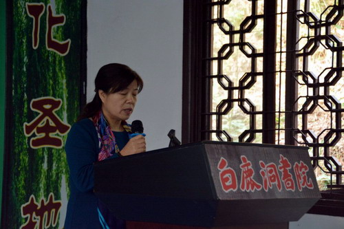 郑州大学副校长张倩红在主题活动开始前作了讲话。她首先对此次活动的顺利举行表示热烈的祝贺,向各位老师同学的积极参与和精心准备表达衷心的感谢。她说:“书院对我国古代的文化教育、学术思想的发展产生过巨大的影响。书院所含有的精神气质和文化使命与现在的大学教育一脉相承。白鹿洞书院与嵩阳书院同为中国古代四大书院,是那个时代教育创新、学术创新、文化创新的中心。九江学院背靠白鹿洞书院,郑州大学紧邻嵩阳书院,共同肩负着传承地域文化,弘扬中华文化的使命。在历史的长河中,嵩阳书院和白鹿洞书院一直有着千丝万缕的联系。最后,愿这荡气回肠的美文诗篇与我们满满的热情融汇聚合,沐浴心智。共同营造一个暖意如春的诗情书院,让中华民族的优秀传统在这新世纪的文化之旅中大放异彩。”