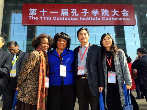 杨副校长和美国萨凡纳州立大学校长助理MABLE MOORE、孔子学院美方院长PEGGY BLOOD、中方院长罗其娟合影