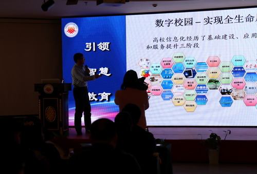 会上,教育部教育信息化专家组秘书长、华东师范大学党委常务副书记任友群教授做了《信息化与高校治理》的主旨报告。他从四个方面进行了阐述,提出要从利益相关主体的角度切入,转变观念,进行体制改革和模式改革,并结合华东师大的实践经验,谈了如何进行顶层设计和标准体系建设,强调了要重视移动互联网的新挑战,重视微信企业号的运用,以数据技术和“云网端”为核心形成“互联网+校园”新形态。任教授的报告对我们下一步的信息化建设提出了非常好的指导意见。
