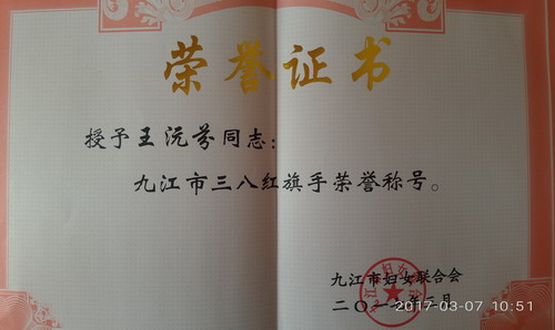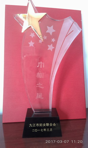 3月7日上午,九江市在市文化艺术中心举行庆祝“三八妇女节”活动,我校外国语学院教师王沅芬荣获“九江市三八红旗手”荣誉称号和“巾帼之星”奖杯,在颁奖典礼上上台领奖,反映了我校女教师的风采,为我校增得了荣誉。