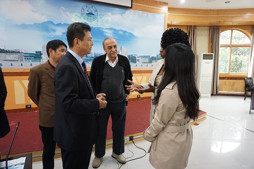 刘晓东校长首先发表致辞,他代表全校师生对来自美国佐治亚州萨凡纳市的访华团成员们表示热烈的欢迎。接着,他对九江学院的历史文化和发展情况作出了介绍。他提到,名山、名江、名湖、名城,造就了九江学院的灵气,尤其是具有千年历史,享有天下书院之首美誉的白鹿洞书院,更为学院赋予了深厚的文化气息和办学氛围。最后他谈到,为使得访问团成员能够更好地体验中华文化,我校对这次访华团代表的行程做了精心安排:既有自然风光欣赏,又有人文景观体验,更有多场文化讲座,相信各位成员此行一定会收获颇丰,也希望大家继续为萨凡纳州立大学孔子学院的各项工作提供支持和帮助。