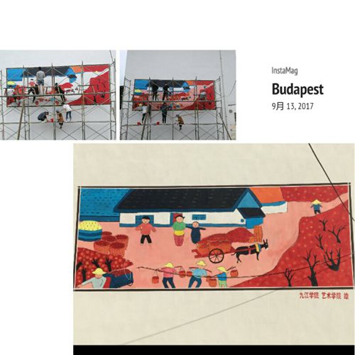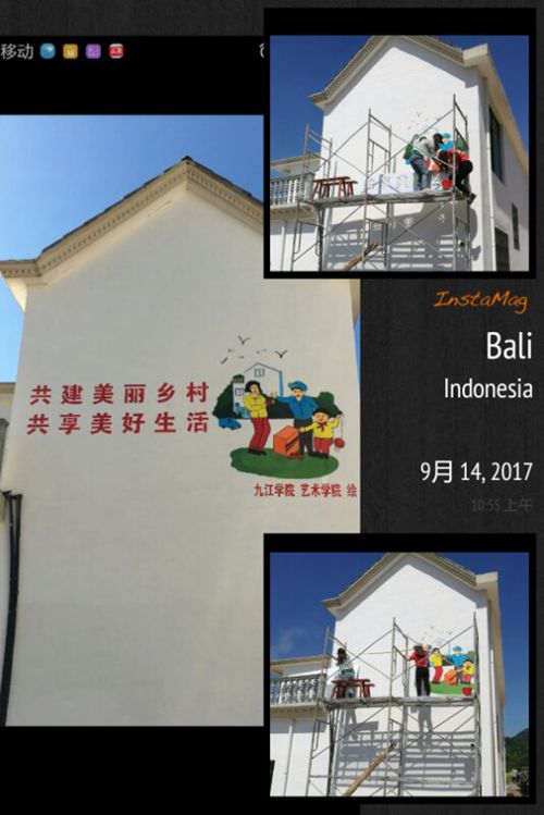 26名师生一到东山,就为东山村美丽的山水风景点赞。美丽的山水风光更加激发了同学们工作的热情。不同类型、不同风格的绘画图,在不同的墙壁铺陈开来,彰显了不同的文化内涵。《农民丰收》的喜庆图喜气大方、《幸福东山》表达了东山村民对未来生活的向往和美好憧憬、《东山渔民图》则表达着东山渔村的风土人情、《美好家园》则表达了东山淳朴的民风。打造“庐山西海滨湖第一村”的口号更表达了东山村人们脱贫致富的勇气和决心。