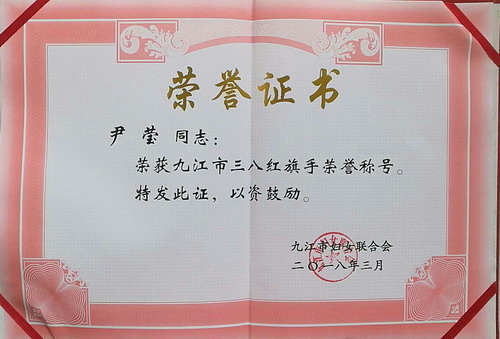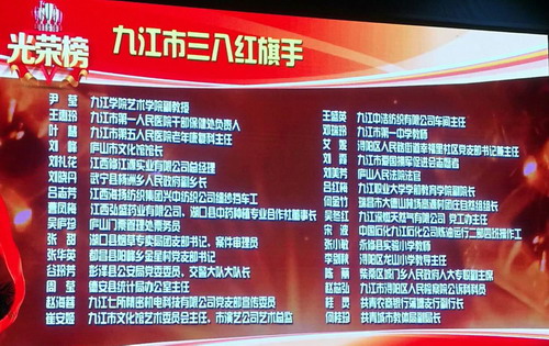 在第108个国际妇女节来临前夕的3月7日上午,九江市妇女联合会在九江市艺术中心举行颁奖大会,表彰全市各条战线上的30名三八红旗手,20个三八红旗集体。我校艺术学院青年教师尹莹喜获九江市三八红旗手荣誉称号。
