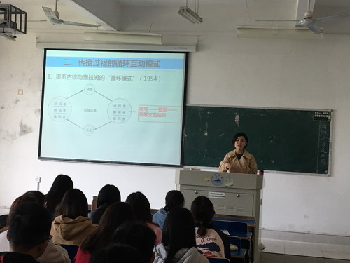 在文友楼301教室,文传学院魏端端老师详细讲解了传播过程中的循环互动模式,重点介绍了香农信息论及奥古斯德与施拉姆循环模式的传播特点。同学们认真听讲,积极和老师互动,课堂教学效果良好。