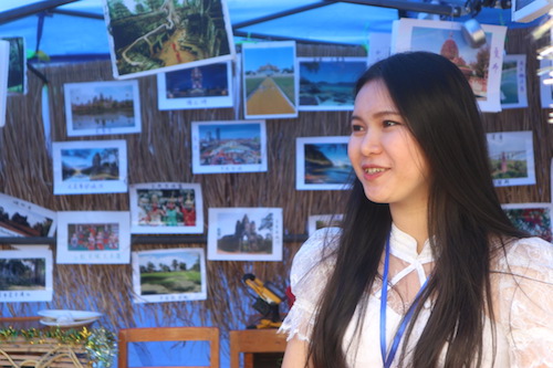 4月15日早晨,一座稻草和竹子巧妙搭建的迷你版吴哥寺轮廓的大门出现在九江学院主校区北区田径场,这是九江学院柬埔寨留学生花费一周时间提前制作完成的。从“吴哥寺”大门进入,两排整齐的帐篷构成一座极具柬埔寨民族风情的“村落”,呈现在观众眼前。上午10:00,开幕式正式开始,九江学院副校长陈春生先生致开幕词,他首先向从全国各地来浔参加本次文化节的柬埔寨同学致以新年的问候,并表示“希望以这次文化节为新的起点,将来的每届柬埔寨文化节都能成为中柬两国文化交流和青年对话的平台,也期待九江学院柬埔寨文化节能够走向社会,辐射更广,对中柬友谊的持续发挥更深远的影响。”九江学院副校长杨耀防与柬埔寨驻中国学生会主席Um Vnty共同为开幕式剪彩。开幕式后,柬埔寨留学生们在摆满鲜花和谷物的祈福台前,进行传统祈福仪式。随后,柬埔寨留学生们伴着优雅而欢快的音乐声载歌载舞,在旁观看的中国青年学生也被庆祝新年的欢快气氛感染,不断有同学加入到舞蹈的队列当中。“村落”两旁的帐篷里有的挂满了柬埔寨民族衣饰,有的铺开几张小桌,上面摆满了各式各样的柬埔寨小吃,精致的外表和鲜艳的颜色吸引着周围的人群不断上前来品尝。在“村落”的最前端,一座帐篷别具一格,内外贴满了表现中柬友好交流史话的文字和图片,一些同学驻足于此,认真地浏览着这些柬埔寨同学们精心准备的图文。