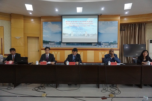 欢迎仪式上,刘晓东校长代表学校致欢迎辞,他首先表达了对迈克尔·莱尼团长及萨凡纳市教育工作者全体嘉宾的问候,对远道而来的美国客人表示热烈的欢迎。他简单介绍了九江学院的办学历史与规模、办学特色和国际交流情况。刘校长说,今年是我校第二次承接美国萨凡纳市教育工作者中国文化体验团,我校高度重视并做了精心安排:既有教学实践、又有学术讲座;既有大学座谈交流,也有中小学考察观摩;既有自然风光欣赏,又有人文景观体验。同时,我们还会走出九江,感受景德镇的陶瓷文化、北京的古都文化等。相信此次项目一定会为萨凡纳市教育工作者了解中国及中国文化、促进中美相互交流和友好起到了很好的作用。最后,刘校长对各位美国校长和教师积极参与孔院活动表示由衷的感谢,对迈克尔·莱尼团长为孔子学院的发展所付出的努力和心血表示赞赏,并相信在迈克尔·莱尼团长和我校选派的中方院长罗其娟的共同努力下,两校通力合作,萨凡纳州立大学孔子学院一定会发展得越来越好。