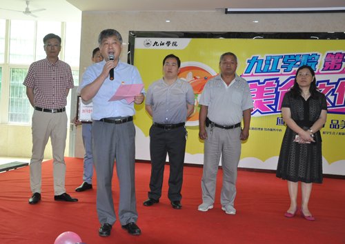 授牌仪式后,夏启国副校长代表学校致辞。他表示一年一度的美食文化节是我校精品校园文化的浓缩,是师生魅力全面展示的平台;是我校后勤饮食部门“以生为本”服务理念的科学诠释,是搭建民族饮食文化交流平台的切实行动,是彰显科学健康饮食文化、推进和谐文明校园建设的重要举措。近年来在全校师生大力支持配合下,后勤管理处取得一系列成绩,荣获“全国高校伙食工作先进集体”、“全国优秀早餐企业”、“中国百家好食堂”、“全国教育后勤系统信息宣传工作先进单位”、“全国教育后勤新科技应用领跑单位”等荣誉,希望以本届美食文化节为新的起点,全校师生员工携起手来、同心同德,坚持“以生为本、规范管理”,弘扬饮食文化,倾情服务师生。最后,夏副校长宣布九江学院第十四届校园美食文化节开幕。