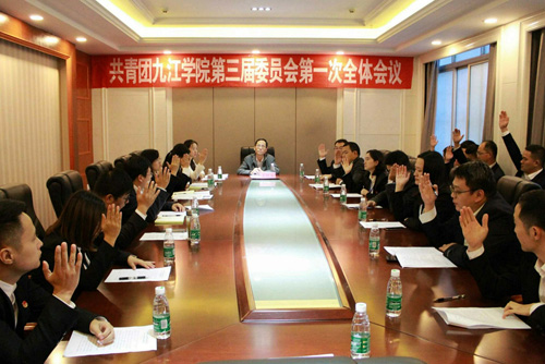 共青团九江学院第三届委员会第一次全体会议于10月12日下午在濂溪宾馆二楼会议室举行。校党委委员、组织部部长王殿元出席会议并讲话。新当选的团委委员参加会议。