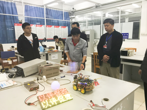 评估专家梅锦春教授在电子设计与开发实训室考察,并与做实验的同学进行交流。