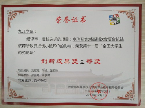 本次论坛分为“专家报告”、“分组汇报答辩”和“学生成果壁报交流”等模块,参赛作品经过壁报展示、论文评审、现场汇报、现场提问以及论坛委员会评议等环节,按照原创性、规范性、创新性的原则评选了优秀壁报奖、优秀论文奖和创新成果奖三类奖项。经过激烈角逐,我校药生学院由张丽芳和余敬谋老师指导、2015级药学专业刘冠霞等同学完成的《水飞蓟宾对高脂饮食复合抗结核药所致肝损伤小鼠PXR的影响》项目获得创新成果三等奖。