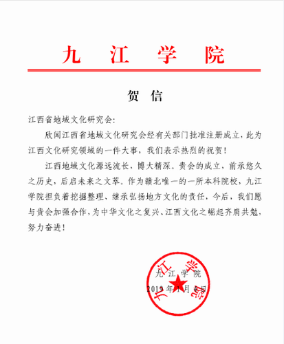 大会宣读了九江学院、南昌师范学院、江西科技师范大学、江西省非遗中心等单位的贺信和贺电。我校的贺信说:“江西地域文化源远流长,博大精深。贵会的成立,前承悠久之历史,后启未来之文萃。作为赣北唯一的一所本科院校,九江学院担负着挖掘整理、继承弘扬地方文化的责任,今后,我们愿与贵会加强合作,为中华文化之复兴、江西文化之崛起齐肩共勉,努力奋进。”