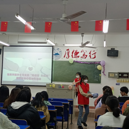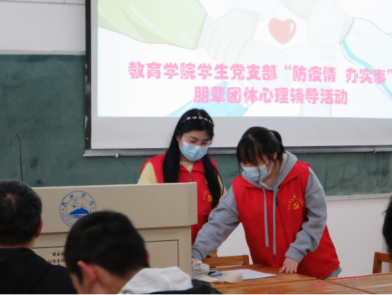 日前,为帮助广大同学做好疫情封校期的心理防护,缓解情绪压力,教育学院党委充分调动学生党支部的积极性和能动性,积极组织该学院应用心理学专业高年级学生党员,走进我校计算机与大数据科学学院、旅游与地理学院十六个兄弟班级,为同学们开展以“同‘心’抗疫 有你有我”为主题的朋辈团体心理辅导活动。