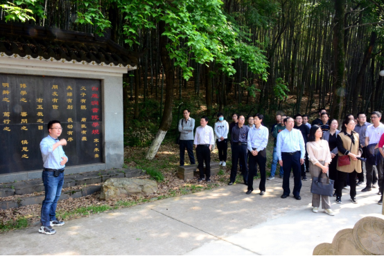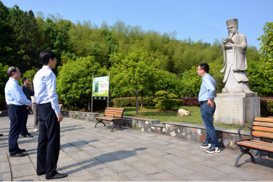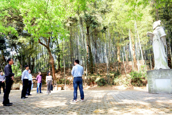 沿小道步行至一片竹林,一尊王阳明雕像矗立眼前,手握书卷、腰挂佩剑,双眉紧蹙、一脸沧桑。通过阳明先生立德立言立功的不凡人生经历,大家深入了解“知行合一”的思想内涵。