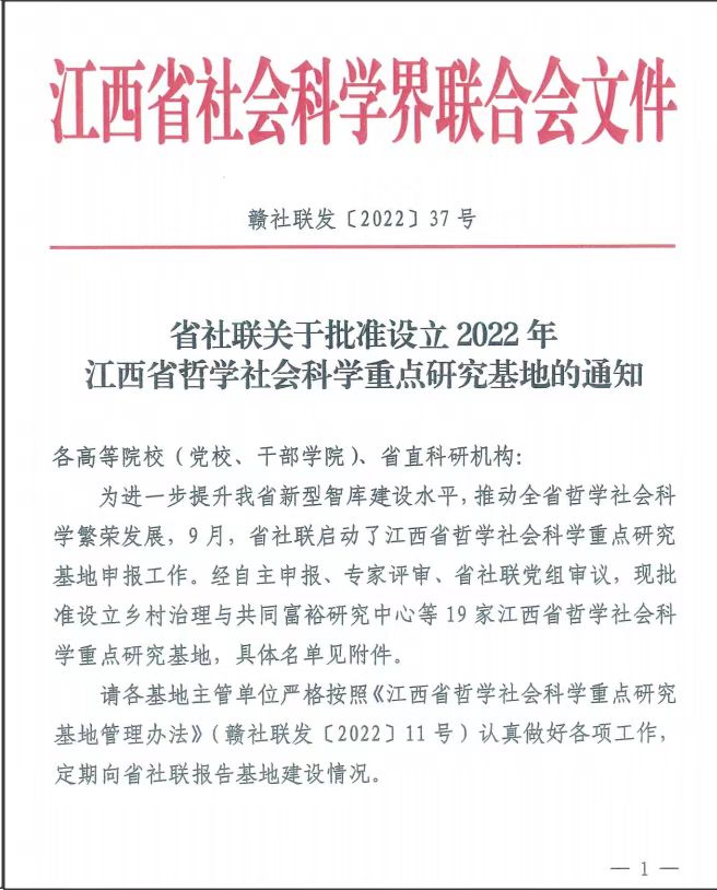近日,江西省社会科学联合会发布了《省社联关于批准设立2022年江西省哲学社会科学重点研究基地的通知》(赣社联发〔2022〕37号),经自主申报、专家评审、省社联党组审议和结果公示,我校“江西长江经济带研究院”成功获批江西省哲学社会科学重点研究基地。此次获批省哲学社会科学重点研究基地,有利于我校研究院加快推动高质量的浔城智库建设和长江经济带区域经济社会发展研究,是我校推进区域性高水平应用型大学建设、深化应用型转型发展和特色化办学的阶段性成果。