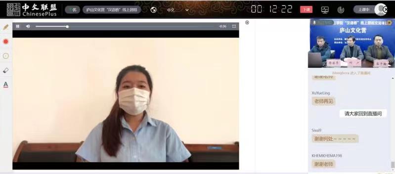 12月16日下午,由教育部中外语言交流合作中心主办,九江学院承办的九江学院2022年“汉语桥”线上交流项目——庐山文化营闭营仪式顺利举行。学校国际合作交流处负责人、柬埔寨皇家科学院孔子学院中方院长以及来自柬埔寨、缅甸和泰国的100多位营员相聚云端,共同见证了此次活动的完美收官。