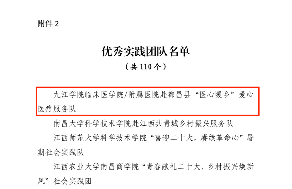 近日,中共江西省委宣传部、江西省文明办、江西省教育厅、共青团江西省委、江西省学生联合会下发了《关于2022年江西省大中专学生志愿者暑期“三下乡”社会实践活动的通报》,我校荣获2022年全省大中专学生志愿者暑期“三下乡”社会实践活动优秀单位,“三下乡”团队“九江学院临床医学院/附属医院赴都昌县医心暖乡爱心医疗服务队”荣获“优秀实践团队”称号,我校教师陈慧君,化学化工学院吴贤男同学荣获“优秀个人”称号。