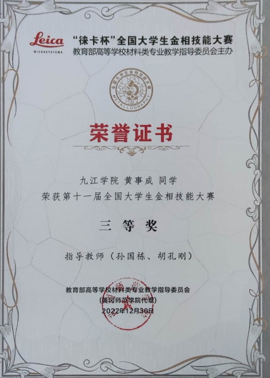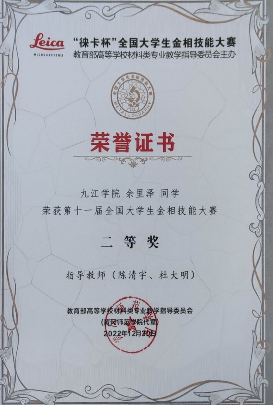 近日,由教育部高等学校材料类专业教学指导委员会主办、黄冈师范学院承办的第十一届全国大学生金相技能大赛落幕,共有来自清华大学、吉林大学、四川大学、武汉大学等414所高校的3700余名在校大学生参加了复赛和决赛阶段的比赛。我校材料科学与工程学院周涛同学荣获个人一等奖,余里泽同学荣获个人二等奖,叶德洲、黄事成同学荣获个人三等奖。