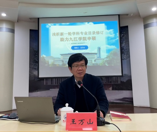 会上,王万山作了题为《浅析新一轮学科专业目录修订,助力九江学院申硕》的培训讲座,总结了新版学科专业目录修订情况,同时,部署了学校新一轮校级一流学科遴选与各学院申硕学位点建设任务。他指出,新版目录延续了学术学位以一级学科为主、专业学位以二级学科为主进行分类、建设与管理的模式;新增的学科专业以交叉学科和专业学位为主,各二级学院申硕工作应以专业学位为主要抓手,同时也要重视学术学位点的建设和申报准备工作,积极探索与其他学院合作建设交叉学科。