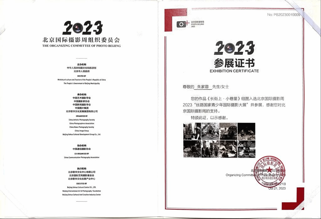 我校艺术学院产品设计专业A2041班朱家蓉同学摄影组照作品《长街上,小巷里》和单张作品《对弈》成功入选北京国际摄影周暨丝路国家青少年摄影大展,朱家蓉同学还获邀出席本届活动开幕式。