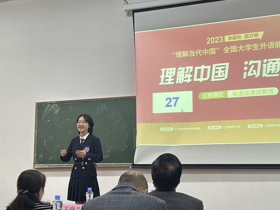 本次大赛采用线上、线下同步的方式举行,演讲和口译大赛江西赛区决赛在江西师范大学举行,阅读、写作、笔译和多语种组4类比赛通过线上进行。在演讲大赛中,外国语学院孔启惠同学获得金奖,外国语学院余果同学、法学院杨佳文同学获得铜奖;在口译大赛中,外国语学院刘祎同学获得银奖,外国语学院孙淑婧同学获得铜奖;在阅读大赛中,外国语学院董雨蒙、曾艺芬同学获得银奖;在写作大赛中,外国语学院陈莹同学获得银奖,外国语学院张学琳娜同学获得铜奖;在笔译大赛中,外国语学院刘茵同学获得金奖,外国语学院徐睿同学获得铜奖;在多语种(日语组)大赛中,外国语学院冷先丹同学获得金奖,外国语学院张玉婷同学获得铜奖。