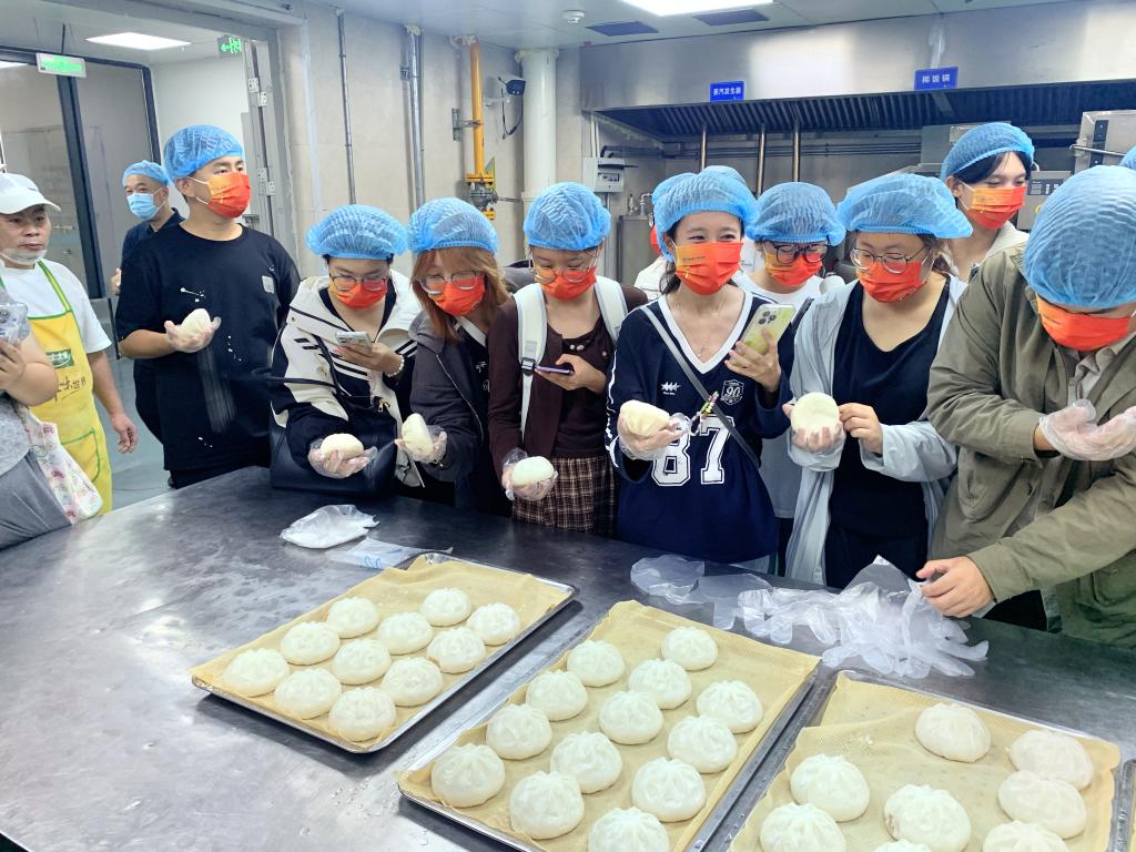 在中心厨房配送区,管理人员化身专业讲解员,为新生们详细剖析“从源头到餐桌”的全链条流程:食材均由资质完备的合作供应商提供,验收时需通过农残等各种快检、资质核查双重关卡;货架上米面油离地离墙摆放,生鲜与冻品分区冷藏,各类食材标识清晰分类存放。如此规范的管理不禁让新生们频频点头,而中央厨房内,米饭生产线、面点生产线、蔬菜洗切生产线、豆腐制品生产线等现代化设备一应俱全,科技赋能餐饮的场景让同学们大开眼界,印象深刻。