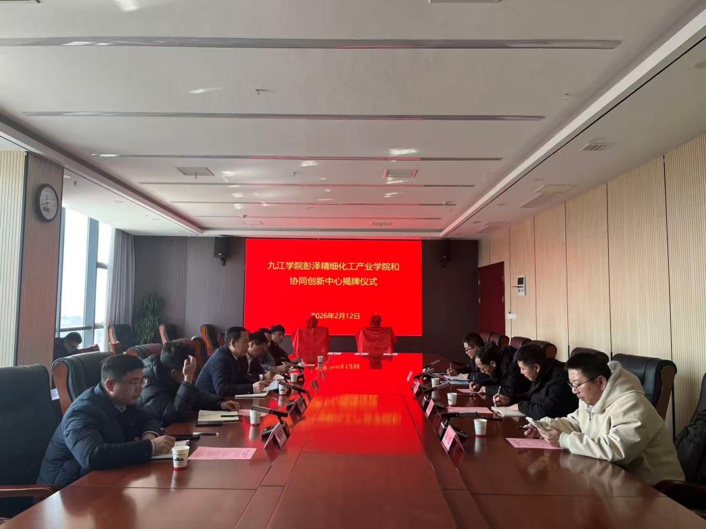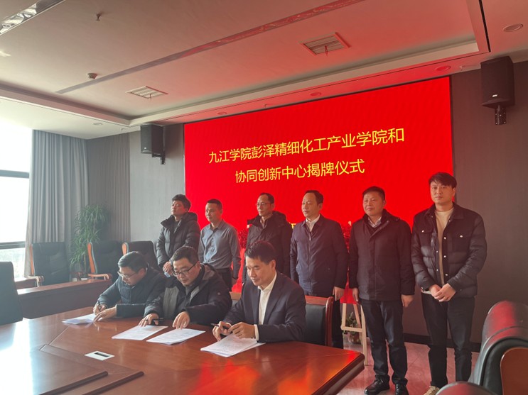 为了进一步落实学校“3353”战略,加强校企合作,促进产学研融合发展。2月12日,由九江学院化学化工学院、江西彭泽工业园区管理管委会携手九江善水科技股份有限公司、江西贝特利新材料有限公司联合组建的彭泽精细化工产业学院与协同创新中心揭牌仪式在彭泽县工业园区管委会举行。九江学院党委副书记王殿元,彭泽县委副书记叶子,化学化工学院党政主要负责人,工业园区管委会主任吴国豪,以及相关企业代表出席本次活动。