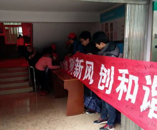 志愿者们将制作好的雷锋同志海报和标语贴在展板上展览,让广大同学更好地了解雷锋,学习他的奉献精神,团结友爱精神。在志愿者们的引导下,同学们纷纷到写有标语的横幅上签上自己的名字,虽然天空飘着小雨,但不一会儿六米长的横幅就被写满了。