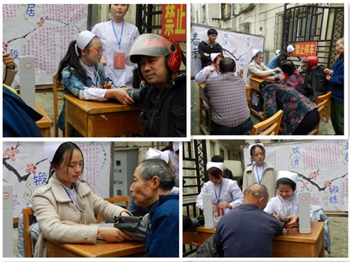 活动中,浔东学生会的学生干部将事先制作好的“春季养生知识“的海报张贴展示,并运用自身所学,为路过的行人测量血压,回答他们的疑问,让他们了解自身的身体状况,适当注意养生。看见有年纪大一点的爷爷奶奶时,同学们还主动上前邀请,并搀扶他们来做体检。