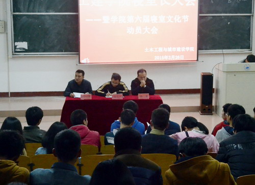 构建文明寝室,共建美好家园。3月26日晚,土建学院在望庐楼阶三教室召开寝室文化节动员大会,学院党委副书记项忠平,学生科科长郭军、副科长刘一男出席本次大会,14级全体寝室长参加了会议。会议由刘一男副科长主持。