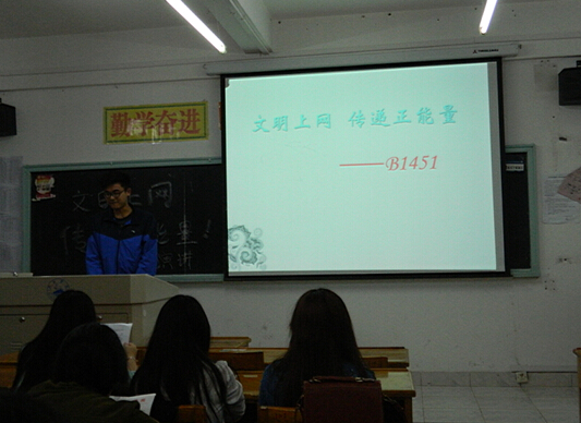 班会上,各班班长利用精心准备的ppt给同学们介绍了当代大学生上网概况、网络安全的重要性和社会危害性等。随后各班以“争当中国好网民”为议题展开讨论,共同分析如何抵制网络谣言、远离低俗文化和网络游戏等,并在微信、博文中发出“青年好声音”倡议。同学们纷纷表态要从自身做起,做网络舆论的战士,积极传递网络正能量。