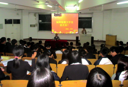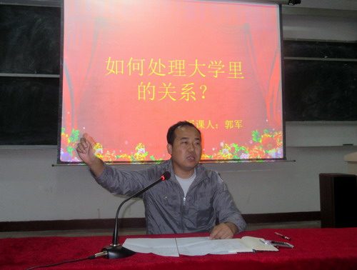 本次讲课主题为“如何处理大学里的关系”。郭军结合自身向同学们讲解了在大学里如何建立良好的人际关系。首先,郭科长将课题分为成长类,情感类,健康类。成长类主要是师生关系、工作学习关系和自我学习能力,在大学里通过良好的处理这些关系能够大大提高自身能力;情感类主要是生活中的各种情感,如交朋友和谈恋爱等出现的情感问题,良好的处理能够让心智越加成熟;健康类则是讲述如何养成健康的生活习惯,应当保持良好的作息,参加各项有益活动和运动,大学生活不应沉迷玩乐。郭科长还讲到了社会实践对自身成长的作用,通过社会实践可以提前了解社会、学习适应社会和积累经验技巧,为以后走向社会做好充分的准备。