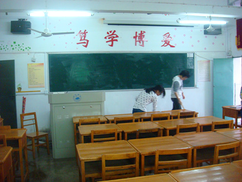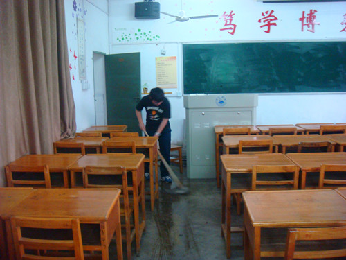 各班劳动委员快速的布置任务后,大家迅速投入战斗。大家的情绪都很高涨,黑板、讲台、门、扶手的死角都被清扫地很仔细,细心的同学在擦玻璃的时候把边框都擦得很干净,桌椅的正反面都细细地擦拭。活动结束后,大家虽然都满头是汗,但看着干净的教室,一张张充满青春的脸上洋溢着笑容。