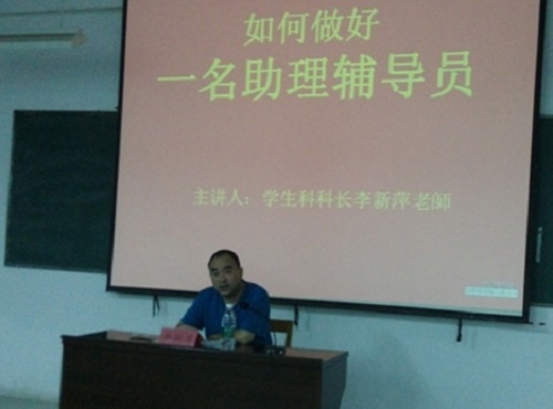 会上,李新萍首先向同学们讲述了助导的基本职责,他认为,要做好一名助理辅导员要勤于学习,善于思考;要端正态度,竭诚服务;要立足学生,加强交流;要满怀激情,应对挑战。随后,他向同学们提出“四会一能一禁止”:即会组织指挥,会处理突发事件,会协调管理,会介绍学校、学院及专业知识;能吃苦耐劳;禁止在担任助理辅导员期间做业务。在他详细的叙述中,同学们明白了作为一名助理辅导员身上的重担,对助理辅导员的工作有了进一步的了解。同学们认认真真听,仔仔细细记。最后,李新萍副科长希望同学们能通过助理辅导员这份工作的洗礼,不断提高自己的综合能力,为自己将来的毕业就业打下坚实的基础。