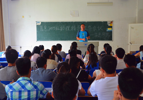 为保证2015级助理辅导员工作的顺利开展,6月23日中午,信息学院于文友楼124召开2015级助理辅导员工作会议。信息学院团委书记贾峰、学生科副科长胥杜鹃、辅导员俞静老师、学生干部以及2015级助理辅导员参加了此次会议。