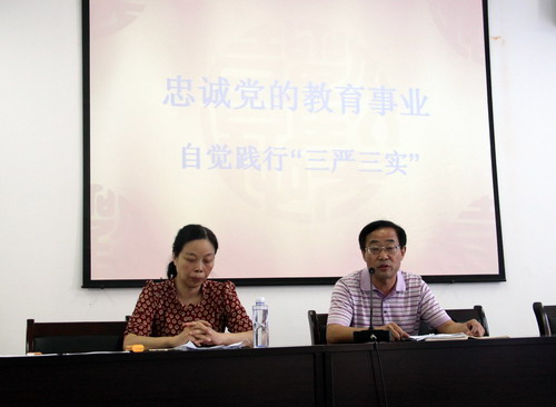 会上,高翔书记以“始终忠诚党的教育事业,自觉践行‘三严三实’”为题讲授了专题党课。首先,高书记深入讲解了“三严三实”的历史背景、内容及科学内涵;然后深刻阐述了如何给合党的群众路线教育实践活动成果,始终忠诚党的教育事业并自觉践行“三严三实”,做到“心中有党、忠诚于党,心中有民、服务师生,心中有责、敢于担当,心中有纪、守纪干净”;最后,高书记就思政部开展落实“三严三实”活动提出了要求,以学习活动为切入点打造好“干部、党员、教师”三支队伍,希望各位干部教师做到“坚定人、明白人、实干人、老实人”。